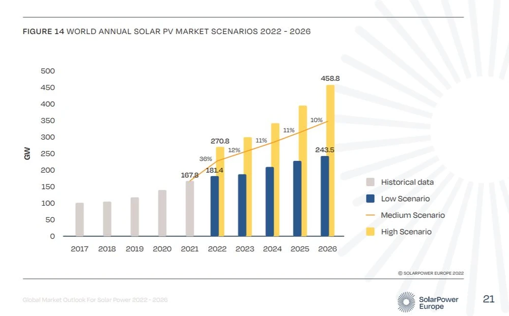 Während die Konsumfreude in vielen Branchen sinkt, hält der Run auf Solaranlagen aufgrund des hohen Strompreises an. SolarPower Europe hat nun eine Prognose für die saubere Sonnenkraft vorgelegt. Der Weltmarkt wachse exponentiell – siehe Grafik. Passend dazu setzen Varta, SolarEdge und SMA Solar auf neue Produkte.