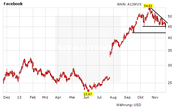 Die Aktie des weltgrößten Sozialen Netzwerks Facebook läuft seit Wochen nach unten. Bei den Charttechnikern läuten die Alarmglocken, nachdem die Unterstützung im Bereich von 45,70 Dollar unterschritten wurde.