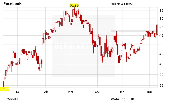 Die Aktie von Ebay ist bereits seit Monaten unter Druck und konnte sich auch zuletzt nicht festigen. Mit dem jüngsten Einbruch hat der Wert zudem ein Verkaufssignal geliefert. Anleger sollten hier das Geschehen vorerst von der Seitenlinie aus beobachten. Vollkommen anders stellt sich das charttechnische Bild bei Facebook dar. Durch den Kursanstieg am Dienstag hat die Aktie ein erneutes Kaufsignal generiert. Das Allzeithoch ist nur noch rund zehn Prozent entfernt. Investoren sollten in jedem Fall engagiert bleiben und sichern ihre bisherigen Gewinne mit einem Stopp bei 35 Euro ab.