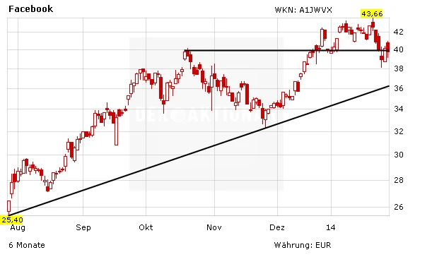 Anleger weltweit warten gespannt auf die Ergebnisse von Facebook. Der Kursverlauf der letzten Wochen lässt den Schluss zu, dass die Geschäfte im vierten Quartal sehr gut verlaufen sind. DER AKTIONÄR hält an seinem Kursziel von 50 Euro fest.