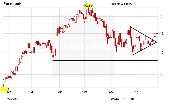 Die Aktie von Facebook konsolidierte in den letzten Wochen in Form eines Dreiecks. Am Freitag gelang der Ausbruch aus diesem Dreieck nach oben. Damit rückt als nächstes Ziel direkt das Allzeithoch bei 52,85 Euro in den Blick. Um das bullische Szenario nicht zu gefährden, sollte der Titel jedoch nicht mehr unter die Marke von 40 Euro fallen.