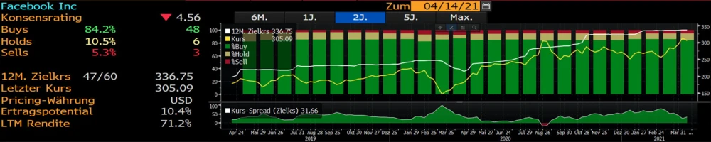 Anleger sollten nach dem „Neutral“-Rating nicht die Flinte ins Korn werfen. Denn mit einem Kursziel von 340 Dollar trauen die Analysten der Aktie des Internet-Riesen immerhin elf Prozent Kurspotenzial zu. Das Konsenskursziel aller 58 Analysten, die die Facebook-Aktie covern, liegt nur bei 336,75 Dollar, bei 48 Kaufempfehlungen.