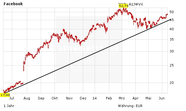 Die charttechnische Situation bei Facebook hat sich merklich verbessert. Das Papier nimmt langsam Kurs auf das Hoch bei 52,85 Euro. Wer seit der Erstempfehlung des AKTIONÄR vom Dezember 2012 dabei ist, kann sich nun über ein Plus von 130 Prozent freuen. DER AKTIONÄR sieht das Kursziel nach wie vor bei 70 Euro und empfiehlt einen Stoppkurs bei 32 Euro.