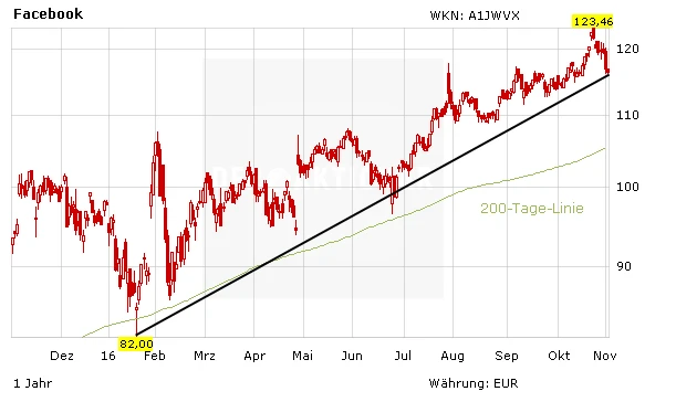 Seit Jahresbeginn legte die Facebook-Aktie um rund 30 Prozent zu. Dieser langfristige Aufwärtstrend ist weiterhin intakt. Zudem sprang der Kurs nach Veröffentlichung der letzten vier Quartalszahlen um sieben Prozent nach oben. Anleger lassen die Gewinne laufen. Kursziel 155 Euro.