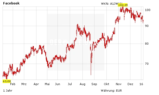 Seit dem Allzeithoch im November bei 102,29 Euro hat die Facebook-Aktie wieder etwas an Boden verloren. Die Aussichten bleiben aber gut, bei dem Internet-Riesen ist noch kein Ende des Wachstums abzusehen. Anleger bleiben an Bord. Das Kursziel des AKTIONÄR lautet 120 Euro.