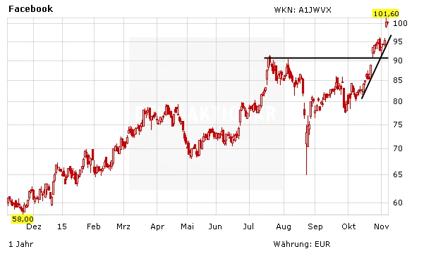 Die Zahlen zeigen: Bei Facebook läuft es derzeit einfach rund. Ein Umsatzwachstum von 41 Prozent steht zu Buche, die Gewinnprognose wurde um fünf Cent pro Aktie übertroffen. Das Unternehmen schafft es immer mehr, mit Smartphone-Nutzern Geld zu verdienen. Der Anteil mobiler Werbung stieg auf 78 Prozent. Anleger bleiben dabei und lassen die Gewinne laufen. Mehr Informationen zur Facebook-Aktie lesen Sie in der nächsten Ausgabe, die ab Freitag Abend hier heruntergeladen werden kann.