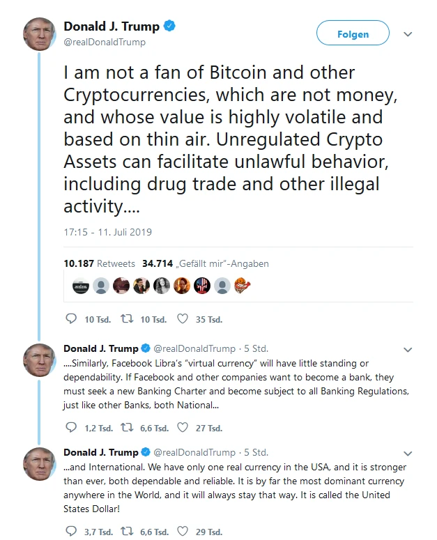 In den letzten Wochen waren US-Präsident Donald Trump und Fed-Chef Powell selten einer Meinung. Doch in Sachen Libra und Kryptowährungen ziehen sie an einem Strang. Beide äußerten sich diese Woche kritisch zur neuen Weltwährung von König Zuckerberg.