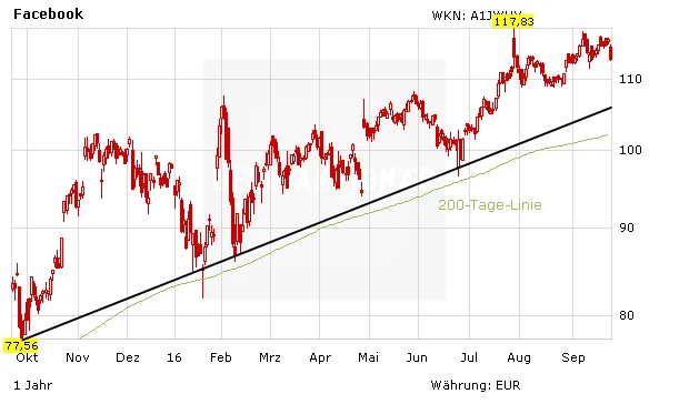 Peinlich, peinlich für Facebook. Die Aktie verliert zwei Prozent. Der IT-Gigant managt den Vorfall jedoch richtig – es sind keine langfristigen Auswirkungen zu befürchten. Die seit der Mitte 2013 anhaltende Rallye geht weiter. Für 2017 erwartet man ein Umsatzwachstum von 36 Prozent. Kein Wunder, dass 86 Prozent der Analysten Facebook positiv bewerten. Auch DER AKTIONÄR bleibt bullish. Zielkurs 135 Euro!