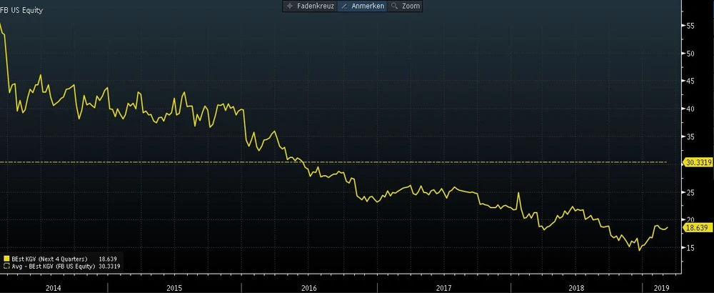 Der Chart unten veranschaulicht, dass von einer Übertreibung bei Facebook – oder gar von Euphorie – dennoch keine Rede sein kann. Gemessen am historischen Durchschnitt der letzten fünf Jahre notiert die Aktie tatsächlich in der Nähe ihrer historischen Tiefs was die Bewertung (KGV) betrifft.