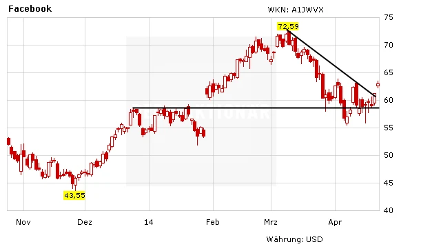Die Aktie von Facebook erreichte ihr Allzeithoch am 3. März bei 72,59 Dollar. Seither befindet sich der Titel im Korrekturmodus und verlor zeitweise rund 25 Prozent. Inzwischen zeigen sich aber wieder erste Käufer. Gestern konnte die Aktie bereits über eine wichtige Abwärtstrendlinie bei rund 62 Dollar steigen. Setzt sich die Aufwärtsbewegung der letzten Tage fort, ist nach Überschreiten des Widerstands bei 63,80 Dollar von einer neuen Aufwärtsbewegung auszugehen. Die nächsten Ziele sind dann bei 66,50 Dollar und später beim Allzeithoch zu suchen. Sollten die heute Abend veröffentlichten Quartalszahlen aber schlechter als erwartet ausfallen, ist mit größeren Kursabgaben zu rechnen. Die nächsten Unterstützungen wären dann bei 55,50 Dollar und darunter 52,00 Dollar zu finden.