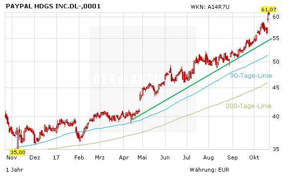 Potential hat der Mobile-Payment-Markt in den USA sowohl für PayPal, dem größten Abwickler von Online-Zahlungen in den USA, als auch für Facebook, der Betreiber des größten Messenger-Dienstes. Beide Aktien befinden sich auf der Empfehlungsliste des AKTIONÄR: PayPal mit einem Kursziel von 65,00 Euro; Facebook mit dem Ziel 170,00 Euro.