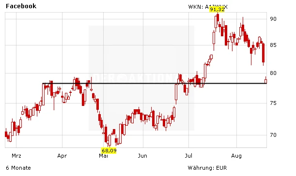Die nächste Unterstützung liegt bei 78 Euro. Sollte diese Marke nicht halten, könnte der Kursverfall weitergehen. Neuanleger behalten Facebook auf der Watchlist und warten mit einem Einstieg ab, bis abzusehen ist, dass die Unterstützung hält. DER AKTIONÄR hat den Titel weiterhin in seinem Aktien-Musterdepot. Ein 2015er-KGV von 43 scheint aufgrund des Umsatzwachstums von 39 Prozent gerechtfertigt. Das Kursziel lautet 110 Euro. Der Stopp-Kurs sollte bei 73 Euro gesetzt werden.