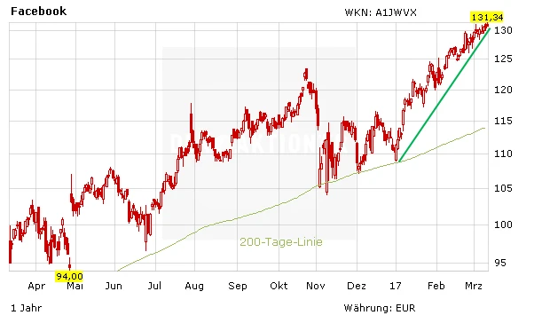 Facebook wird den Wandel zur Video-First-Plattform nicht sofort vollziehen können. Ein derartiger Umbau dürfte den Großteil des Jahres 2017 andauern. Die Wachstumswarnung, die Facebook Ende des dritten Quartals 2016 ausgab, hat damit auch 2017 Bestand. Die positiven Aussichten bringen jedoch bereits jetzt die Facebook-Aktie auf Allzeithoch. Wer der Empfehlung des AKTIONÄR zu einem Kurs von 109,15 Euro folgte und den Rücksetzer Ende 2016 zum Zukauf nutzte, kann sich über ein Plus von rund 20 Prozent freuen. Aktuelle Empfehlung: Gewinne laufen lassen.