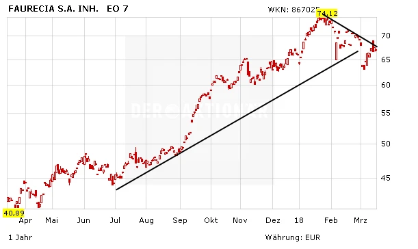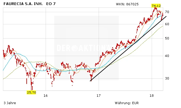 Faurecia entwickelt sich zu einem der Trendsetter in der Zuliefererbranche. Der Umsatz soll im laufenden Jahr um mindestens sieben Prozent steigen. Dabei soll laut Analysten ein Gewinn pro Aktie von 5,83 Euro hängen bleiben. Die Wachstumsraten sind hoch, die Aussichten durch die spannenden, innovativen Produkte und gute Partnerschaften extrem erfreulich. Die Aktie hat schönes Upside-Potenzial.