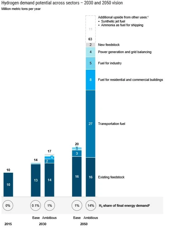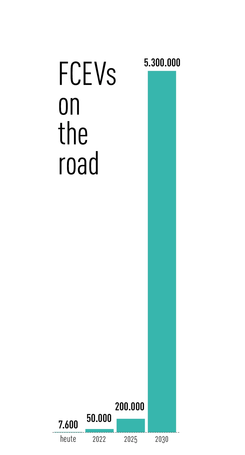 Denn der Mythos, Brennstoffzellen-Autos würden immer zu teuer bleiben, löst sich in Luft auf. Zwischen 2025 und 2030 werde bereits der Pivot-Punkt erreicht, ab dem die Gesamtkosten eines Brennstoffzellen-Autos niedriger als die eines klassischen Verbrenners werden. Schon jetzt hat die Technologie Vorteile bei Gabelstaplern oder kleinen Lastwagen, da eine höhere Beladung und schnelleres Nachtanken als bei Elektroautos möglich ist.