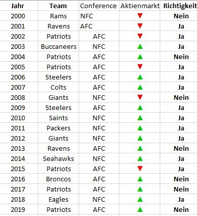 Die Football-Liga NFL besteht aus zwei Teilen, den sogenannten Conferences AFC und NFC. Der Super-Bowl-Indikator besagt: Gewinnt eine Mannschaft aus der AFC, gibt es eine Baisse. Gewinnt ein Team aus der NFC, gibt es eine Hausse.