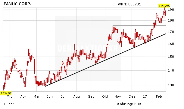 Fanuc dürfte vom Robotik-Trend profitieren und auch in Zukunft zahlreiche Aufträge außerhalb von Asien erhalten. In den vergangenen Wochen zogen die Papiere des japanischen Konzerns kräftig an. Sicherlich sind die Papiere mit einem KGV von 35 kein Schnäppchen. Doch die Perspektiven für Industrieroboter und intelligente Automation sind vielversprechend. Risikobewusste Anleger können eine kleine Position mit einem Stopp bei 137,00 Euro aufbauen.