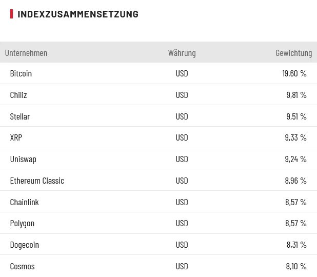 Entsprechend ist Dogecoin derzeit wohl der spekulativste und volatilste Coin im Krypto TSI  Index. Mit einer Gewichtung von aktuell rund acht Prozent geht das allerdings in Ordnung