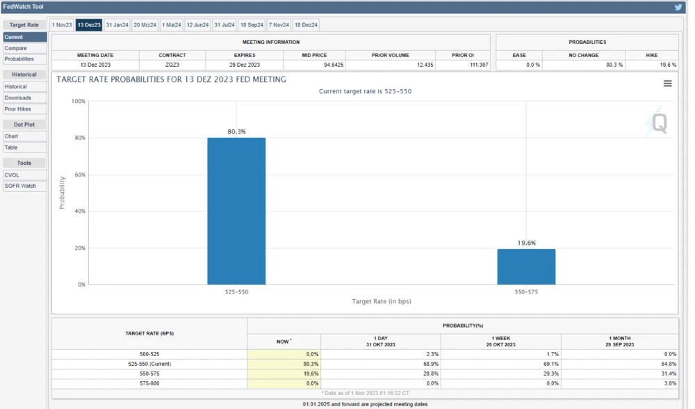 Profi-Anleger sehen aktuell mit fast 20 Prozent Wahrscheinlichkeit eine Zinserhöhung im Dezember wie das FedWatch Tool zeigt.