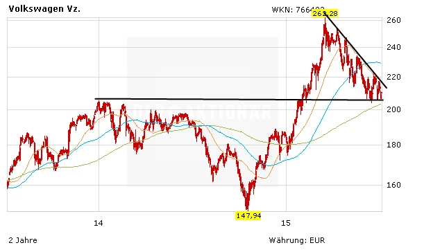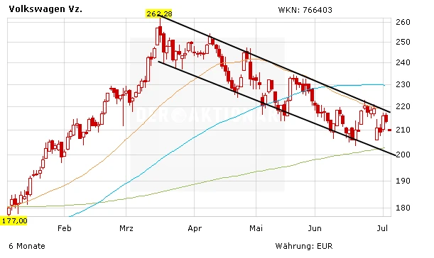 Ohnehin sieht die VW-Aktie derzeit interessant aus. Zuletzt traf das Papier auf eine ausgeprägte Unterstützung sowie die ansteigende 200-Tage-Linie., die bei rund 205 Euro verläuft. Jetzt ist es wichtig, den kurzfristigen Abwärtstrend bei rund 220 Euro zu knacken. Im Anschluss sollte die Aktie dann peu a peu Richtung altes Hoch bei 262,28 Euro marschieren. Ein freundlicher Gesamtmarkt vorausgesetzt, wird die VW-Aktie am Jahresende deutlich höher notieren. DER AKTIONÄR hält durchaus Kurse von 275 Euro für machbar.