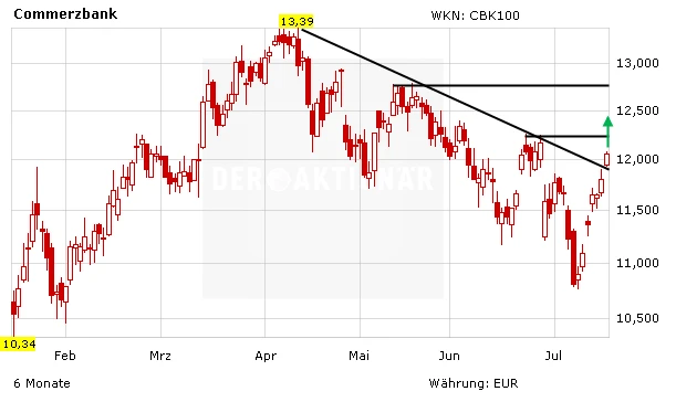 Dreimal startete die Commerzbank-Aktie in den vergangenen drei Monaten den Versuch, den Abwärtstrend zu verlassen. Nun hat es endlich geklappt. Mit dem Sprung über die Marke von 11,90 Euro wurde das entsprechende Kaufsignal generiert.