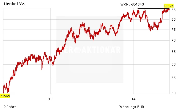 Die Henkel-Vorzugsaktie kannte in den letzten Jahren nur eine Richtung – nach Norden! Im Sommer 2009 wurden die Papiere des Konsumgüterherstellers noch für unter 25 Euro gehandelt. Bis Ende 2013 konnte der Kurs um rund 250 Prozent zulegen und erreichte am 21. Januar 2014 ein Verlaufshoch bei 85,99 Euro. Seitdem konsolidiert der DAX-Titel diese Kursrallye. Mitte April nahm die Aktie dann wieder Fahrt auf. Wie schon zu Jahresbeginn wurde die Kursrallye aber im Mai im Bereich der 86-Euro-Marke gestoppt. Kann dieser horizontale Widerstand überwunden werden, sollten die Henkel-Papiere zunächst bis in den Bereich um 90 Euro vorstoßen.