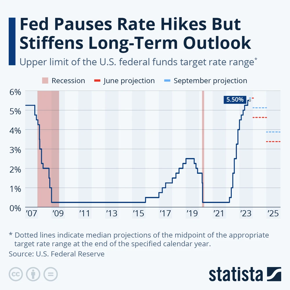 Die Fed hat Ende September verkündet, zunächst eine Zinspause einzulegen, nachdem seit März 2022 insgesamt elf Zinsanhebungen stattgefunden haben. Es zeigt sich ein gemischtes Konjunkturbild in den USA, was es für die Notenbank noch schwieriger macht, da sie sehr genau abwägen muss. Anleger müssen weiterhin wie die Notenbanken selbst "auf Sicht fahren" und die weitere Entwicklung der nationalen und internationalen Konjunktur genau beobachten.