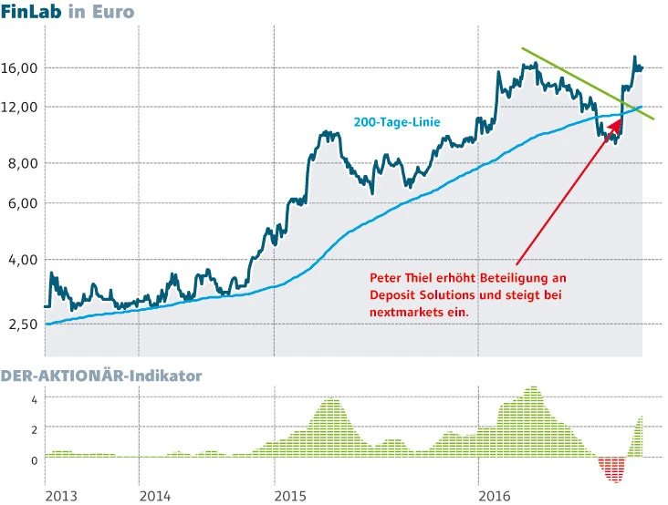 Die Tatsache, dass Peter Thiel bei den Fin- Lab-Beteiligungen investiert hat, kommt einem Ritterschlag gleich. Für Analyst Christopher Rodler von Montega liefern die jüngsten Finanzierungsrunden den Beweis dafür, dass die Beteiligungen der FinLab über vielversprechende Geschäftsmodelle verfügen und noch Wertsteigerungen zu erwarten sind. Den aktuellen NAV pro Aktie beziffert Rodler auf 20,30 Euro, das Kursziel nach einem Risikoabschlag von 15 Prozent auf 17,30 Euro. Das Analysehaus GBC hat sein Ziel nach den Transaktionen auf 18,32 Euro angehoben.