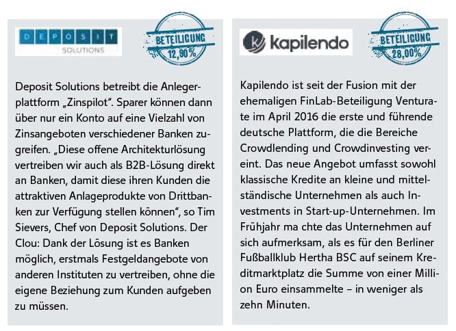 Das Hamburger Start-up Deposit Solutions sammelte im Juli 15 Millionen Euro ein, darunter bei Thiel und Lead- Investor FinLab, die jeweils ihre Beteiligung aufstockten, sowie bei drei neuen Partnern. Bei der Finanzierungsrunde wurde die Firma mit 110 Millionen Euro bewertet, mehr als viermal so viel wie bei FinLabs Erstinvestment im September 2015. „Mit ihrem strategischen Ansatz und ihrer Technologie hat Deposit Solutions das Potenzial, den neun Billionen Euro schweren Markt für Privatkundeneinlagen in Europa komplett umzukrempeln“, sagt FinLab-Vorstand Stefan Schütze.