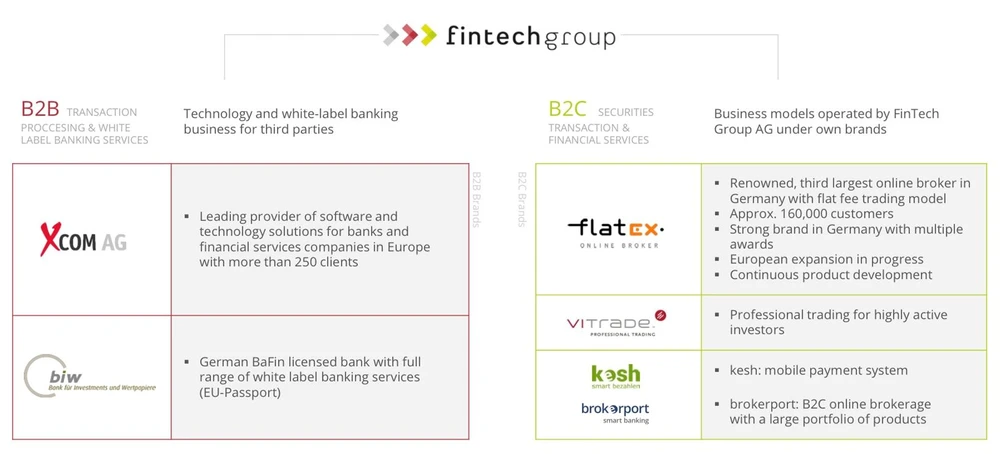 Der Bewertungsabschlag zum Wettbewerb ist angesichts der Positionierung und der operativen Erfolge nicht nachvollziehbar. Die Fintech Group deckt mit dem Online-Broker Flatex, der Technolgietochter Xcom AG und der biw Bank die gesamte Wertschgöpfungskette des Wertpapierhandels ab (siehe Diagramm unten). Mit der hochskalierbaren Banken- und Technologieplattform ist der Konzern ein wichtiger Partner für die deutsche Start-up-Szene im Fintech-Bereich, wie nicht zuletzt die jüngste Zinsgold-Kooperation mit Rocket Internet zeigt. Diese Assets würden eigentlich einen Aufschlag gegenüber den Wettbewerbern rechtfertigen.