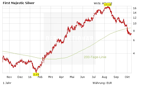 Die angeschlagene Aktie kletterte um 1,5 Prozent ins Plus auf 8,00 Dollar. Die Papiere versuchen sich damit an einer Bodenbildung. Für einen erneuten Einstieg ist es allerdings noch zu früh. Sollten die Papiere nachhaltig über die 200-Tage-Linie laufen, die aktuell bei 9,00 Dollar verläuft, dann wäre das ein neues Kaufsignal. Bis dahin beobachten Anleger die Entwicklung der First-Majestic-Aktie und die des Silberpreises genau.
