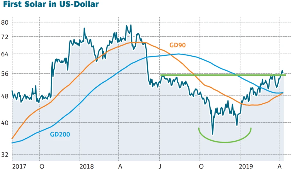 Seit Ende 2018 gab es wieder Preiserholungen für Solarmodule. Entsprechend optimistisch gibt sich First Solar auch für das laufende Geschäftsjahr: Das Unternehmen peilt einen Umsatz von 3,25 bis 3,45 Milliarden Dollar an, unter dem Strich soll ein Gewinn von 2,25 bis 2,75 Dollar zu Buche stehen. Hält die positive Entwicklung im Solarsektor an und der Solar-Player kann liefern, dürfte First Solar die zuletzt gestartete Aufwärtsbewegung fortsetzen.