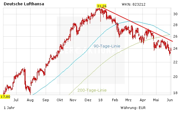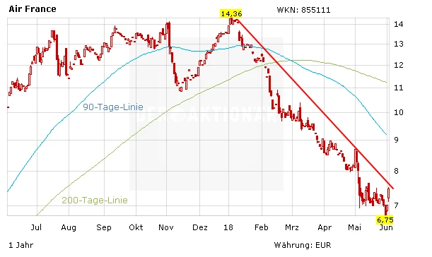 Die Aktien von Air France-KLM stiegen am Montag sogar noch stärker - allerdings nicht wegen verbesserter Gewinnaussichten. Am Wochenende hatte die Zeitung Les Echos berichtet, der französische Staat wolle sich von seinem 14,3-prozentigen Anteil an Air France trennen. Eine Möglichkeit sei der Einstieg der Hotelkette Accor. Auch bei der Air-France-Aktie ist der Abwärtstrend weiterhin intakt.