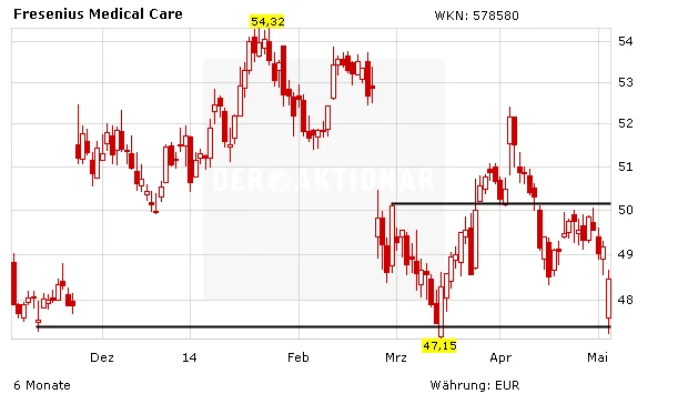 Die Zahlen kommen bei den Marktteilnehmern nicht gut an. Kurz nach Handelseröffnung führt FMC die Verliererliste im DAX an. Eine wichtige Unterstützung findet sich im Bereich der 47-Euro-Marke. Investierte Anleger beachten den Stopp bei 45 Euro.