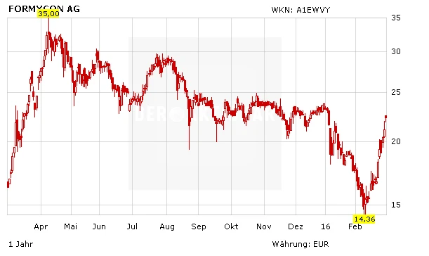Die Aktie von Formycon gewinnt zum Wochenbeginn mehr als fünf Prozent auf 22,23 Euro. Formycon wurde vom Biotech-Report (www.biotechreport.de) wiederholt als Top-Favorit im Biotechsektor bezeichnet. Wichtige Neuigkeiten zu Formycon lesen Sie auch in der nächsten Ausgabe des Biotech-Report, der am Dienstag, 1. März um 16 Uhr erscheint. Den Börsenbrief können Sie hier bequem abonnieren.