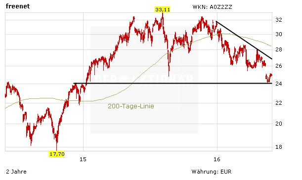 Vorstandsvorsitzender Christoph Vilanek deckte sich mit 10.000 Aktien zum Preis von 25,03 Euro ein. IT-Vorstand Stephan Esch kam mit 24,26 Euro sogar noch ein bisschen günstiger zum Zug. Völlig verständlich unter dem Aspekt der Dividende. Diese soll laut den von der Nachrichtenagentur Bloomberg befragten Experten von 1,55 Euro auf 1,60 Euro je Aktie 2017 steigen. Auf dem aktuellen Kursniveau weist der TecDAX-Titel damit eine Rendite von über sechs Prozent auf.