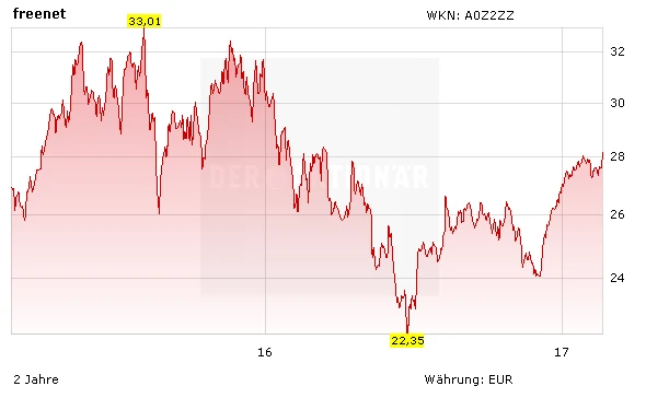 Die Freenet-Aktie startet heute einen Versuch, ihre Aufwärtsbewegung fortzusetzen. Erweist sich der Sprung über die 28-Euro-Marke als nachhaltig, wäre der Weg für weiter steigende Kurse geebnet. Die nächste größere Widerstandszone wartet dann erst im Bereich um 31 Euro.
