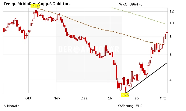 Die Fachleute des Trendbrief erklären, die Freeport-McMoran Copper & Gold Inc. gehört zu den weltgrößten Gold- und Kupfer-Produzenten. Nach dem jahrelangen Abwärtstrend für die Rohstoffpreise und entsprechend des Aktienkurses dürfte die Notierung jetzt zur alten Stärke zurückfinden. Mit dem Überschreiten der 50-Tage-Linie und der 100-Tage-Linie hat sich das Chartbild bereits verbessert. Schon bald könnte der Kurs die 200-Tage-Linie bei derzeit etwas mehr als zehn Euro wieder überwinden. Dann erschließt sich der Wert weiteres Aufwärtspotenzial bis 15 oder sogar 20 Euro. Anleger sollten die schwankungsanfällige Aktie deshalb mit einem Stoppkurs bei 4,50 Euro kaufen.