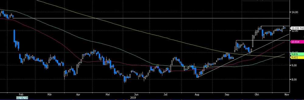 Viel freies Feld hätte indes auch der Aktienkurs, sobald es gelingt, das Mehr-Monats-Hoch bei 12,46 Euro zu überwinden. Denn dann stehen die Chancen sehr gut, dass relativ rasch auch das durch die überraschende Gewinnwarnung im Februar aufgerissene Gap bei 13,31 Euro geschlossen wird.