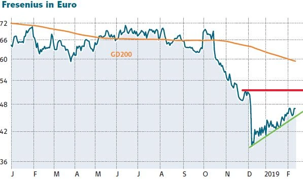 Mit dem gestrigen Kurssprung ist die Aktie auf ein neues 2-Monatshoch geklettert. Die nächste Hürde, die es zu überwinden gilt, ist das Dezemberhoch 2018 bei 52,44 Euro. Bei knapp 60 Euro wartet die wichtige 200-Tage-Linie. DER AKTIONÄR hat die Aktie von Fresenius Anfang Dezember mit einem Abstauberlimit eingesammelt und kann sich nun bereits über die ersten Gewinne freuen. Anleger bleiben investiert, sichern ihre Position aber mit einem auf 39,50 Euro nachgezogenen Stopp nach unten ab.