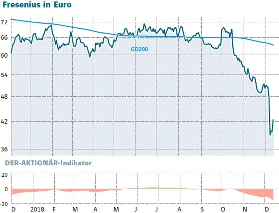 Das zwischenzeitliche Minus seit Oktober betrug zeitweise mehr als 45 Prozent. Die negativen News sind mittlerweile im Kurs eingepreist. Das sehen auch die Analysten der Privatbank Berenberg so, die für die Aktie eine Kaufempfehlung mit einem Kursziel von 70,95 Euro ausgesprochen haben. Mit dem jüngsten Kurssturz seien die Sorgen um die weitere Entwicklung des Medizinkonzerns inzwischen mehr als eingepreist, so Analyst Tom Jones. Anleger brauchten nun Geduld, denn es sei nicht eine Frage des "ob", sondern des Zeitpunkts, zu dem das Krankenhausgeschäft wieder zurück zu nachhaltigem operativen Wachstum finde. 2019 werde sicherlich ein mittelmäßiges Jahr, auch weil die Tochter Kabi mit einem starken Vorjahr zu kämpfen habe.