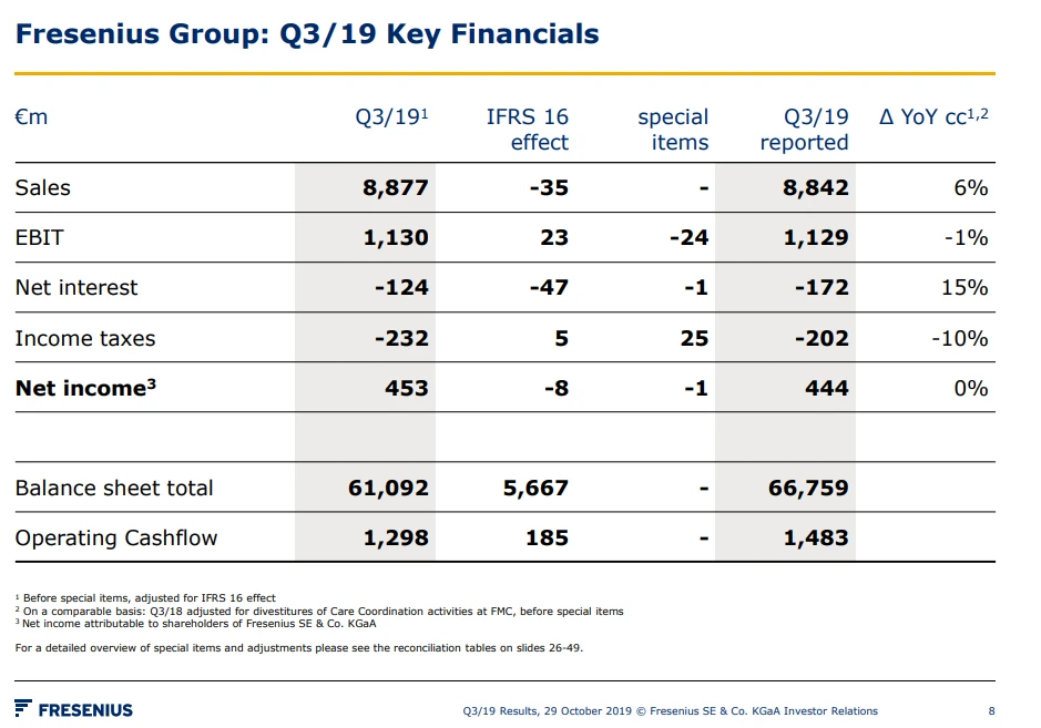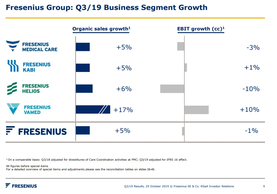Gegenüber dem Vorjahr legten die Umsätze von Fresenius im dritten Quartal wechselkursbereinigt um sechs Prozent auf 8,9 Milliarden Euro zu. Das Ergebnis vor Zinsen und Steuern (EBIT) ging währungsbereinigt leicht um ein Prozent zurück. Unter dem Strich blieb der währungsbereinigte Gewinn mit 453 Millionen Euro unverändert. Das war dennoch deutlich mehr als von Analysten erwartet.