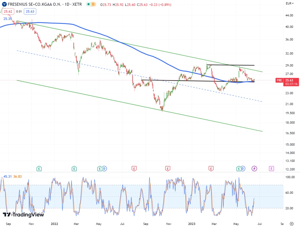 Seit dem Mai-Hoch bei 29 Euro hat sich die Aktie um gut zwölf Prozent verbilligt. Die Chancen stehen nun gut, dass die Bullen wieder einen Anlauf auf die Oberseite des seit September 2021 gültigen Abwärtstrendkanals unternehmen. Hoffnung dabei macht, dass Fresenius den GD 200 erfolgreich als Support getestet hat und der Stochastik-Indikator vom überverkauften in den neutralen Bereich zurückgekehrt ist. Mit dem Ausbruch über die Oberseite des Trendkanals bei 27,85 Euro würde dann ein frisches Kaufsignal ausgelöst. Das Momentum könnte ausreichen, um im Anschluss direkt die wichtige 29-Euro-Marke anzugreifen.