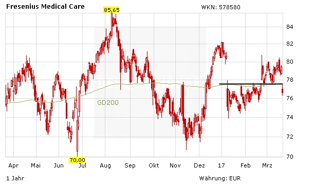 Gerade als sich die Aktie des Dialyse-Spezialisten Fresenius Medical Care (FMC) anschickte, in Richtung alter Höchststände zu marschieren, musste das Papier einen herben Rücksetzer hinnehmen. Mit einem Minus von 3,7 Prozent ist die Aktie der größte Verlierer des Tages im DAX. Mit diesem Rücksetzer ist der Wert auch unter die charttechnisch wichtige Unterstützung in Form der 200-Tage-Linie gerutscht und hat damit ein Verkaufssignal generiert. Grund für den schwachen Tagesverlauf ist eine Studie der Schweizer Großbank UBS. Diese sieht FMC schon bald mit sinkenden Margen konfrontiert. Vor allem für das Geschäft in Nordamerika sieht Analyst Ian Douglas-Pennant Gefahren und senkte seine Einschätzung für den Wert von "Buy" auf "Sell". Das Kursziel strich er von 100 auf 68 Euro zusammen. Der Margenanstieg bei FMC nähere sich dem Höhepunkt, so der UBS-Experte. Von wenigen Ausnahmen abgesehen, hätten die Margen während der vergangenen zehn Jahre zwischen 16 und 18 Prozent gelegen, 2016 sogar bei 19,5 Prozent. Dazu hätten in erster Linie Kosteneinsparungen beigetragen, auch da Patienten mit chronischen Nierenerkrankungen zunehmend statt des teureren Medikaments Epogen von Amgen das günstigere Mittel Mircera von Roche verabreicht worden sei. Der Dialysespezialist FMC habe Anfang 2015 damit begonnen, seine blutbildungsanregenden Substanzen (ESAs) zunehmend von Roche statt von Amgen zu beziehen. Dadurch steige aber auch der Druck der Krankenversicherer. Die dürften darauf drängen, an den geringeren Kosten teilzuhaben.