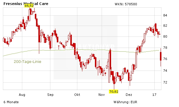 Dementsprechend geht es mit der Aktie von Fresenius Medical Care in den Keller. Fast sechs Prozent verliert das Papier zu Wochenbeginn auf 75,74 Euro und rutscht dabei auch unter die 200-Tage-Linie. Dies zieht auch den Mutterkonzern Fresenius mit nach unten. Die Aktie verliert am Montagvormittag 3,4 Prozent auf 72,35 Euro. Anleger sollten hier nun vorerst den Ausgang der derzeitigen Entwicklungen abwarten.