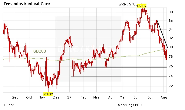Die ohnehin charttechnisch angeschlagene Aktie von FMC reagiert auf die heutige Übernahmemeldung mit einem weiteren Kursabschlag. Am frühen Nachmittag verliert das Papier 2,2 Prozent auf 77,40 Euro. Damit ist die Aktie knapp daran gescheitert, die 200-Tage-Linie wieder nach oben zu durchbrechen. Die nächsten wichtigen Unterstützungen warten nun im Bereich von 75 Euro. Bei knapp 74 Euro befindet sich das Jahrestief.