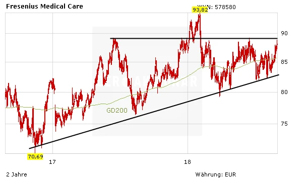 Die Aktie von Fresenius Medical Care hat sich in den vergangenen Tagen enorm stark präsentiert. Derzeit befindet sich das Papier nur noch knapp unter dem Junihoch von 89,24 Euro. Gelingt der Sprung darüber, dürfte es relativ rasch in Richtung des Allzeithochs bei 93,82 Euro gehen, das im Februar dieses Jahres markiert wurde. Zuletzt haben sich auch einige Analysten positiv zu dem Wert geäußert. Die britische Investmentbank HSBC hat Fresenius Medical Care von „Hold" auf „Buy" hochgestuft und das Kursziel von 89 auf 107 Euro angehoben. Nach einem durchwachsenen und von Währungseffekten sowie Sonderbelastungen geprägten ersten Halbjahr dürften sich der Gewinnmix und die Transparenz wieder verbessern, so Analyst Richard Latz in seiner neuesten Studie. Der Dialyse-Anbieter biete strukturelles Wachstum und ein attraktives Chance/Risiko-Profil. Der Einstiegszeitpunkt sei günstig.