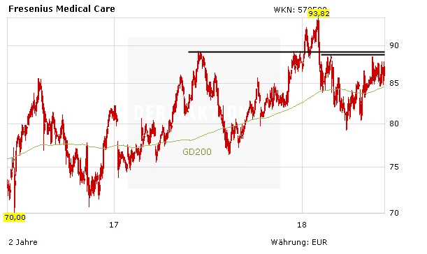 Auf die Aktie von FMC hat die kleine Übernahme indes wenig Auswirkung. Der Titel befindet sich leicht im Minus. Unterstützung erhält die Aktie von der 200-Tage-Linie, nach oben wartet eine wichtige Marke bei 88,78 Euro. Knapp darüber verläuft außerdem das 2017er-Hoch. Gelingt der Sprung darüber, dürfte relativ rasch das bisherige Rekordhoch bei 93,82 Euro, das im Februar dieses Jahres markiert wurde, in den Fokus rücken. Anleger lassen ihre Gewinne mit einem Stopp bei 69 Euro weiter laufen.