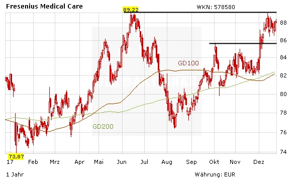 Die gute Entwicklung spiegelt sich auch in der Aktie von Fresenius Medical Care wider. Der Wert notiert nur noch ganz knapp unter dem bisherigen Allzeithoch von 89,22 Euro. Ein Ausbruch über diesen Widerstand würde ein neues Kaufsignal bedeuten.