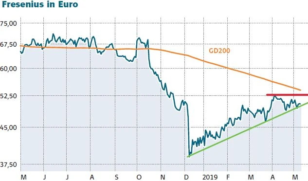 Die Aktie von Fresenius verliert zum Wochenauftakt 2,5 Prozent auf 49,19 Euro. Damit ist der Wert der fünftschwächste Wert des Tages im deutschen Leitindex DAX. Schwächer notieren nur noch Infineon, Daimler, Continental und ThyssenKrupp. ThyssenKrupp verliert sogar mehr als sieben Prozent. Die Aktie von Fresenius war bereits am Freitag deutlich unter Druck geraten. Zuvor war das Papier zum zweiten Mal am Ausbruchsversuch auf ein neues Jahreshoch gescheitert.